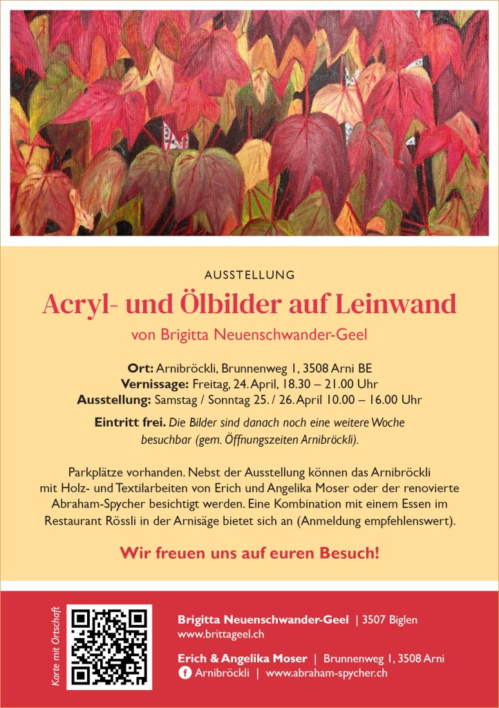 Nun habe ich mein Atelier seit 10 Jahren. Das heisst JUBILÄUM! Das hat mich veranlasst, in diesem Jahr zum ersten Mal meine Bilder öffentlich auszustellen. Die Vernissage wird am 24. April 2026 in der Arnisäge bei Moser Angelika und Erich im Arnibröckli sein. Ich freue mich schon jetzt darauf. Nähere Angaben werden folgen.